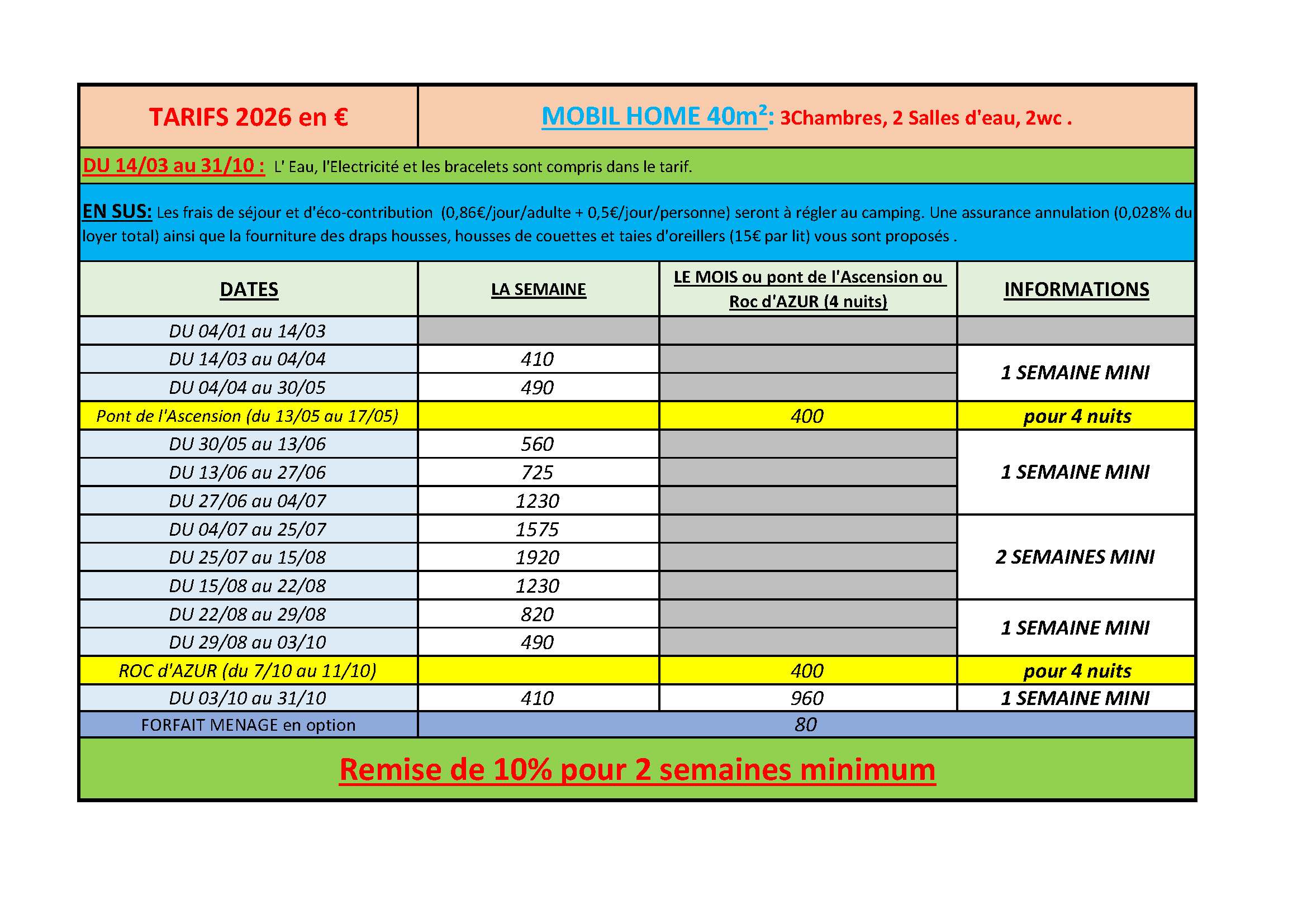 De même pour le ménage en fin de séjour avec un chèque de caution (pas d’espèces) de 80€.